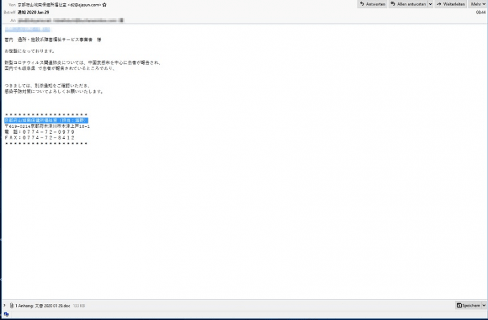 As per the emails sent to people in Japan, it misinforms the recipients that the virus has spread to Japan and prompts the users to open the attachment. If the attachment is opened, then the malware extracts personal data.